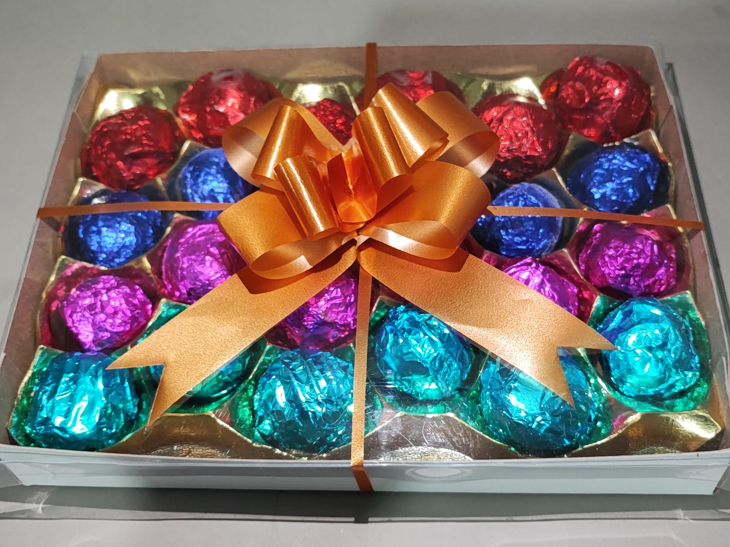 Una caja de joyas de chocolate con 4 sabores diferentes. Incluye 6 piezas de trufas de Amaretto, 6 de Maní y Arroz Inflado, 6 de Baileys y 6 de Cacao Intenso. Cada una es una obra artesanal del maestro chocolatero.