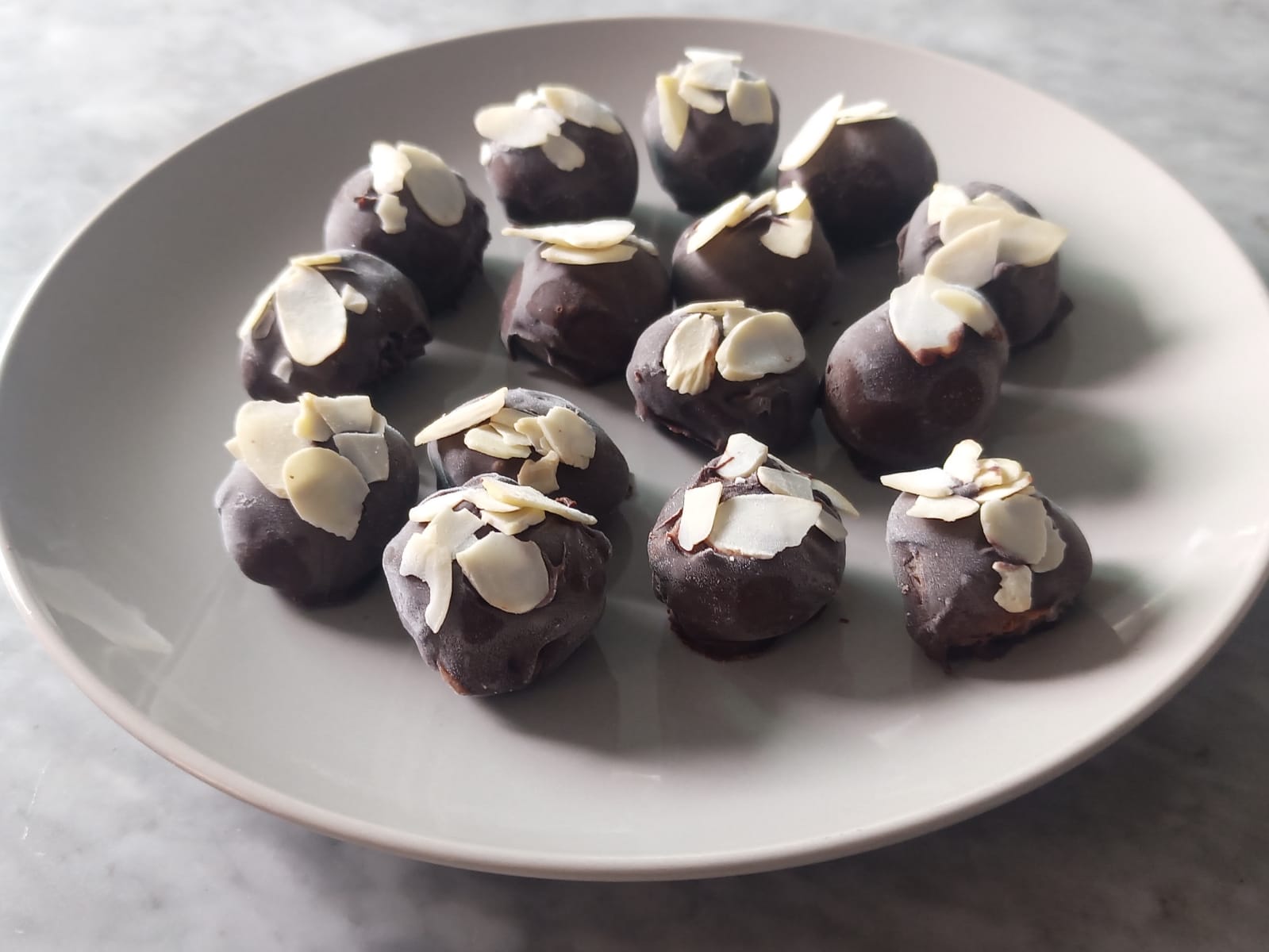 Cada trufa se sumerge en un suave chocolate amargo que contrasta maravillosamente con la dulzura del relleno de amaretto. Para dar el toque final, decoramos estas joyas con almendras fileteadas, que añaden una textura crujiente y un toque de elegancia.